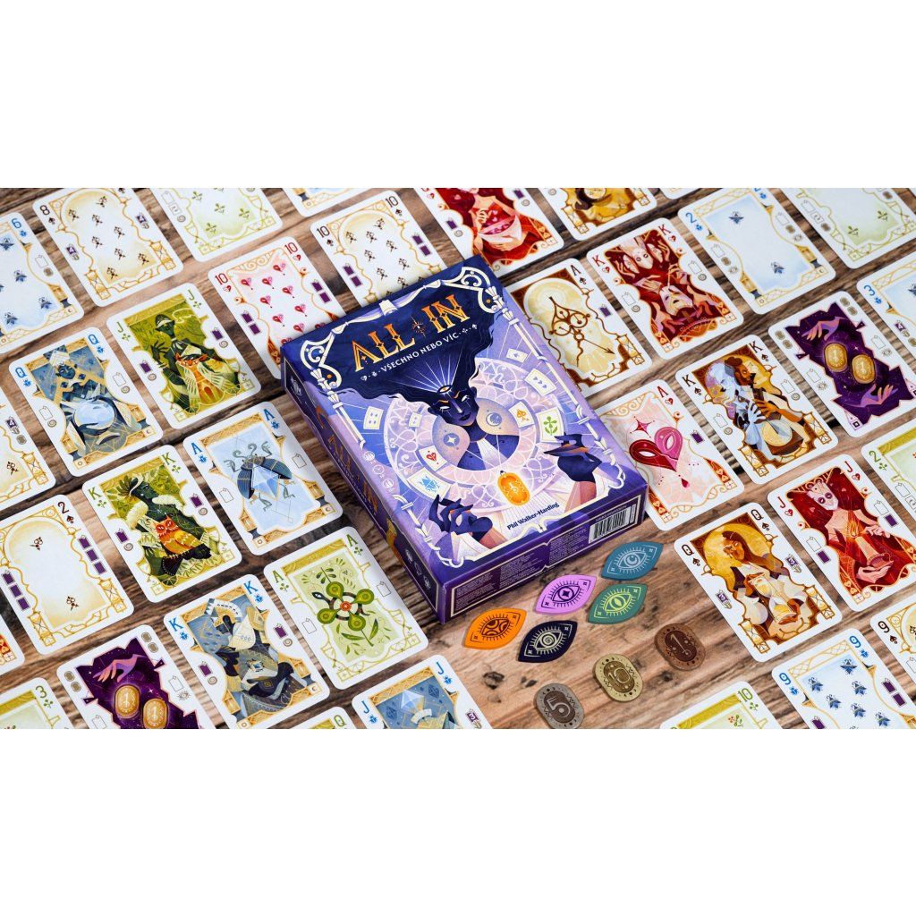 DOKÁŽETE NAKLONIT ŠTĚSTĚNU NA SVOU STRANU? ALL-IN: Všechno nebo víc vás zve ke (znovu)objevení klasické karetní hry. Využijte své schopnosti a hrajte s nejlepšími kartami. Nezapomeňte dávat pozor na akce spoluhráčů, abyste co nejlépe předpověděli, kdo sestavuje nejsilnější kombinaci. Předpovězte vítěznou kombinaci, vytvořte tu nejsilnější a získejte nevýslovné bohatství! Hrajte karty tak, aby vám zůstala v ruce co nejsilnější kombinace. Na konci každého kola hráči získávají runy na základě kombinace karet ve své ruce a také z banku, pokud se jim podaří úspěšně odhadnout, kdo má v ruce nejsilnější kombinaci. Po uplynutí 3 kol vítězí hráč s nejvíce runami. - Vykládejte karty, využívejte jejich efekty a vezměte svůj osud do vlastních rukou. - Sestavte nejlepší kombinaci a zahrajte all-in, abyste ji zpečetili. - Předpovězte vítěznou kombinaci a získejte bank! OSUD JE NEJISTÝ, ROZHODUJTE SE MOUDŘE! Proč byste si měli hru koupit - Nabízí chytrý mix karetních kombinací a psychologie hráčů, kdy neustále zvažujete nejen svou ruku, ale i úmysly ostatních u stolu a snažíte se číst jejich rozhodnutí i náznaky chování. - Díky krátké herní době se snadno dostane na stůl i ve chvílích, kdy není prostor na dlouhé strategické hry, přesto však nabídne plnohodnotný herní zážitek. - Mechanika předpovědí vytváří napětí až do samotného konce kola a nutí vás přemýšlet několik tahů dopředu, protože každý odhad může zásadně ovlivnit bodový zisk. - Akce all-in přináší silné momenty, které dokážou otočit vývoj partie a dávají prostor odvážným rozhodnutím, jež ostatní hráče vyvedou z rovnováhy. - Jednoduchá pravidla umožňují rychlé vysvětlení novým hráčům, přesto hra nabízí dostatek hloubky, aby se k ní skupina ráda vracela opakovaně. - Variabilita díky oboustranným přehledovým kartám mění pořadí kombinací a zajišťuje, že každá partie může probíhat trochu jinak než ta předchozí. - Interakce mezi hráči je přirozená a nenucená, protože každý tah, dobrání karty či vyložení kombinace může ovlivnit rozhodování ostatních u stolu. - Hra funguje velmi dobře v různých počtech hráčů a zachovává si napětí jak ve dvou, tak v plném obsazení pěti hráčů. - Téma práce s osudem a předpověďmi je elegantně propojeno s herními mechanikami bez zbytečných pravidlových komplikací nebo umělých omezení. - ALL-IN: Všechno nebo víc je ideální volbou pro hráče, kteří mají rádi karty, ale hledají titul, kde rozhoduje úsudek, odvaha i správné načasování. OBSAH BALENÍ: 54 karet 5 přehledových karet 5 žetonů předpovědi 50 run 4 rámečky, česká a slovenská pravidlaDoplňkové parametry