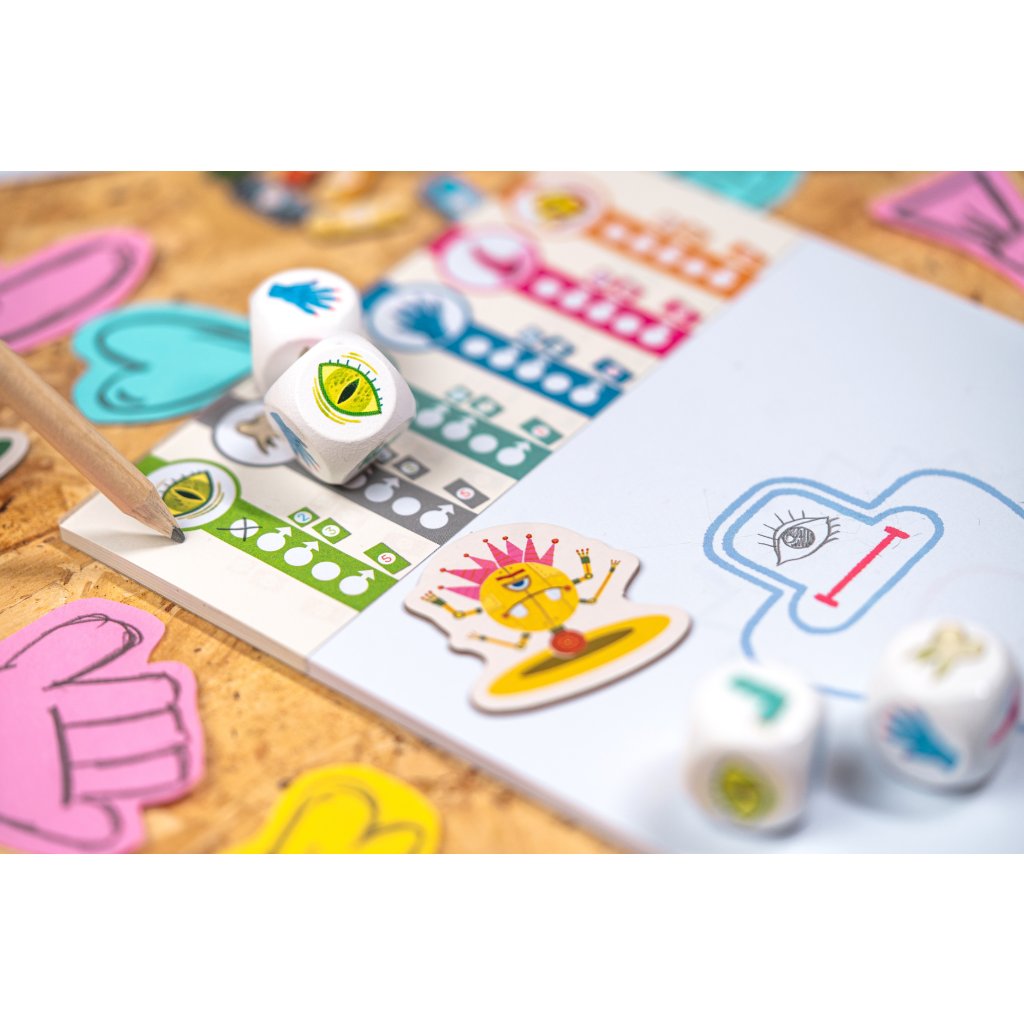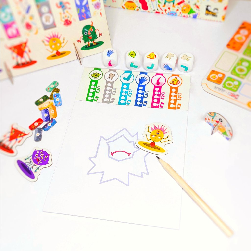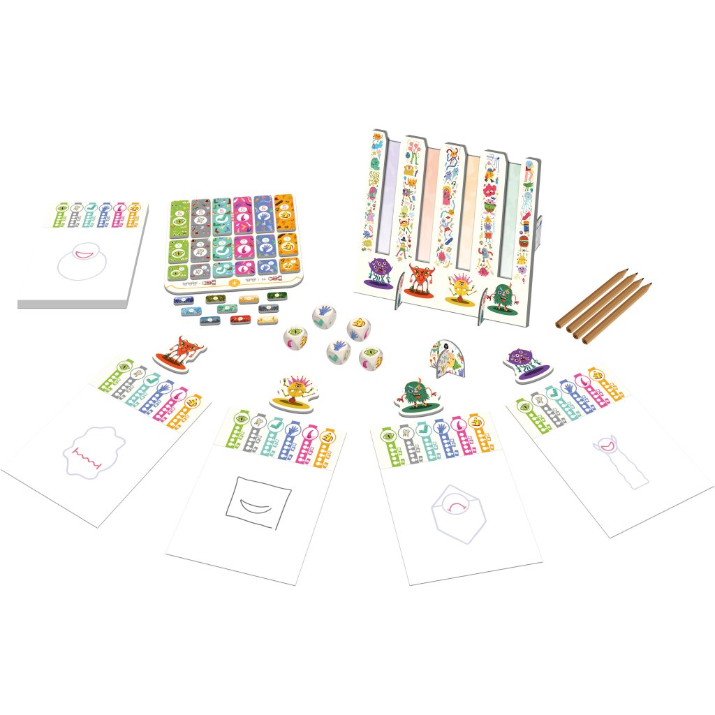 - Nakreslí vybranou část na svou příšeru. Mezitím si hráč po jeho levici vybere jednu ze zbylých kostek a položí ji před sebe. Také si zaškrtne políčko odpovídajícího symbolu a nakreslí část příšery. Tyto kroky provedou jeden po druhém všichni hráči.