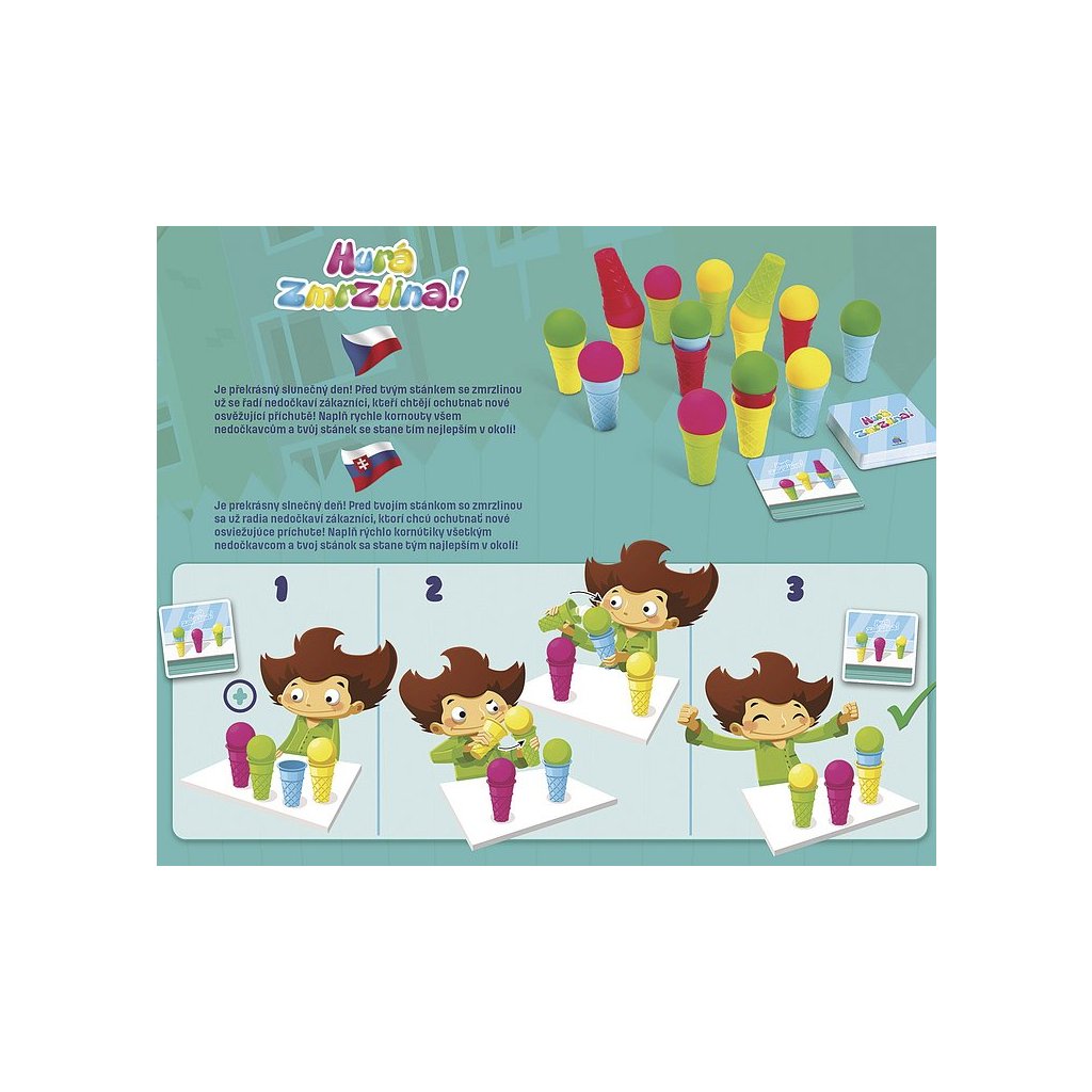 Obsah balení: pravidla, 54 karet zadání, 16 kornoutků, 12 kopečků zmrzliny