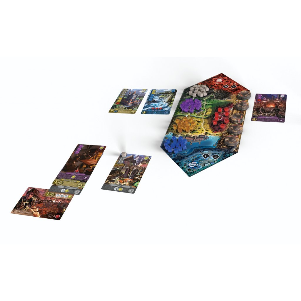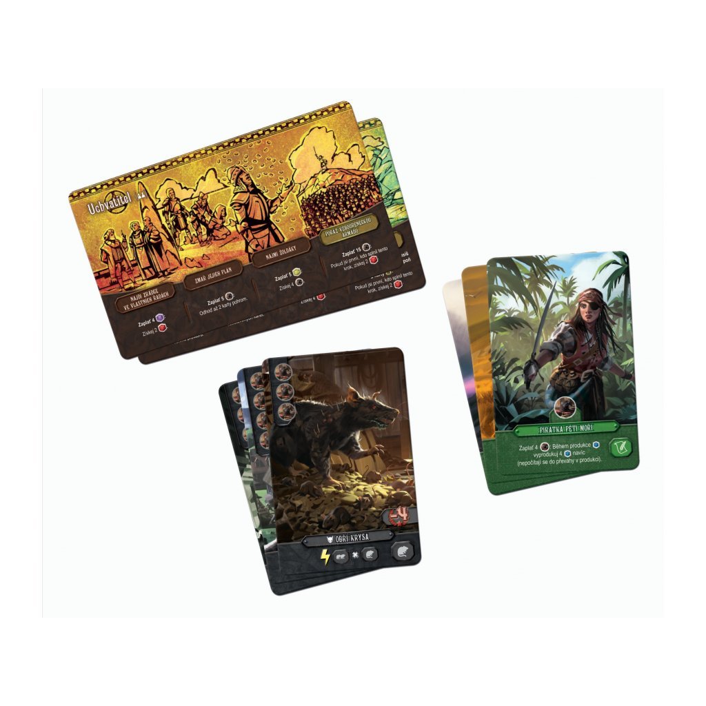 - 130 karet (2 karty vévodství, 70 karet rozvoje, 10 karet pokladů, 8 karet pohrom, 26 karet hrozeb, 14 karet rádců)