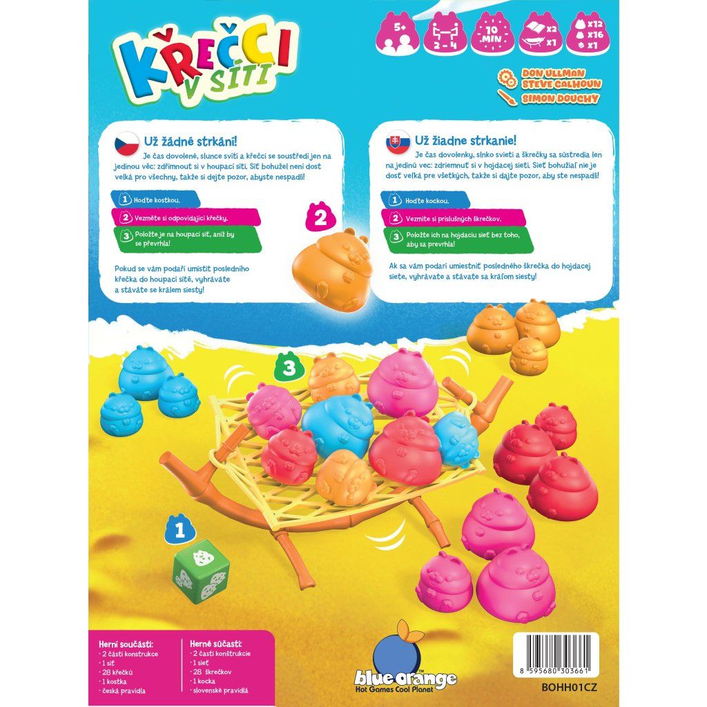 Křečci si vzali dovolenou! Slunce svítí a křečci se soustředí jen na jedinou věc: zdřímnout si v houpací síti. Síť bohužel není dost velká pro všechny. Dokážete najít tu správnou rovnováhu, aby křečci nespadli? Místa je jen malinko! Buďte prvním hráčem, kterému nezůstanou žádní křečci! Všichni vaši křečci musí být buď v houpací síti, nebo odložení v krabici. Ve svém tahu hodíte kostkou, jež vám řekne, kterého křečka nebo křečky umístíte na houpací síť. Hra končí, jakmile jeden z hráčů umístí svého posledního křečka na houpací síť, aniž by spadl. Tím vyhrává! Proč byste si měli hru koupit - Každá partie vás udrží v pozornosti, protože síť reaguje i na velmi jemné změny a každý tah může situaci převrátit. - Rychlá délka hry umožní odehrát několik partií za sebou a vytvořit příjemnou rodinnou soutěž. - Herní průběh je vždy jiný díky proměnlivým výsledkům kostky a různým možnostem, kam umístit křečky. - Jednoduchá pravidla dovolí pustit se do hry bez dlouhého vysvětlování a zapojí hráče všech věkových kategorií. - Balancování podporuje trpělivost i zručnost a děti nenásilně vede k lepšímu odhadu těžiště. - Pád křečků nespouští zdlouhavé tresty, ale rychlou změnu kola, takže hra působí svěže a nevznikají hluchá místa. - Roztomilé zpracování a výrazné barvy pomáhají vtáhnout i malé hráče, kteří si figurky rychle oblíbí. - Vhodná je i pro příležitostné hraní, protože příprava zabere jen několik vteřin. - Můžete ji vzít prakticky kamkoli, protože nezabere mnoho místa a během okamžiku je připravena ke hře. - Celkové zpracování nabízí dostatečnou variabilitu i po mnoha odehraných partiích a zůstává dlouhodobě zábavné. Obsah balení: 2 části konstrukce sítě 1 síť 28 křečků 1 kostka česká a slovenská pravidlaDoplňkové parametry