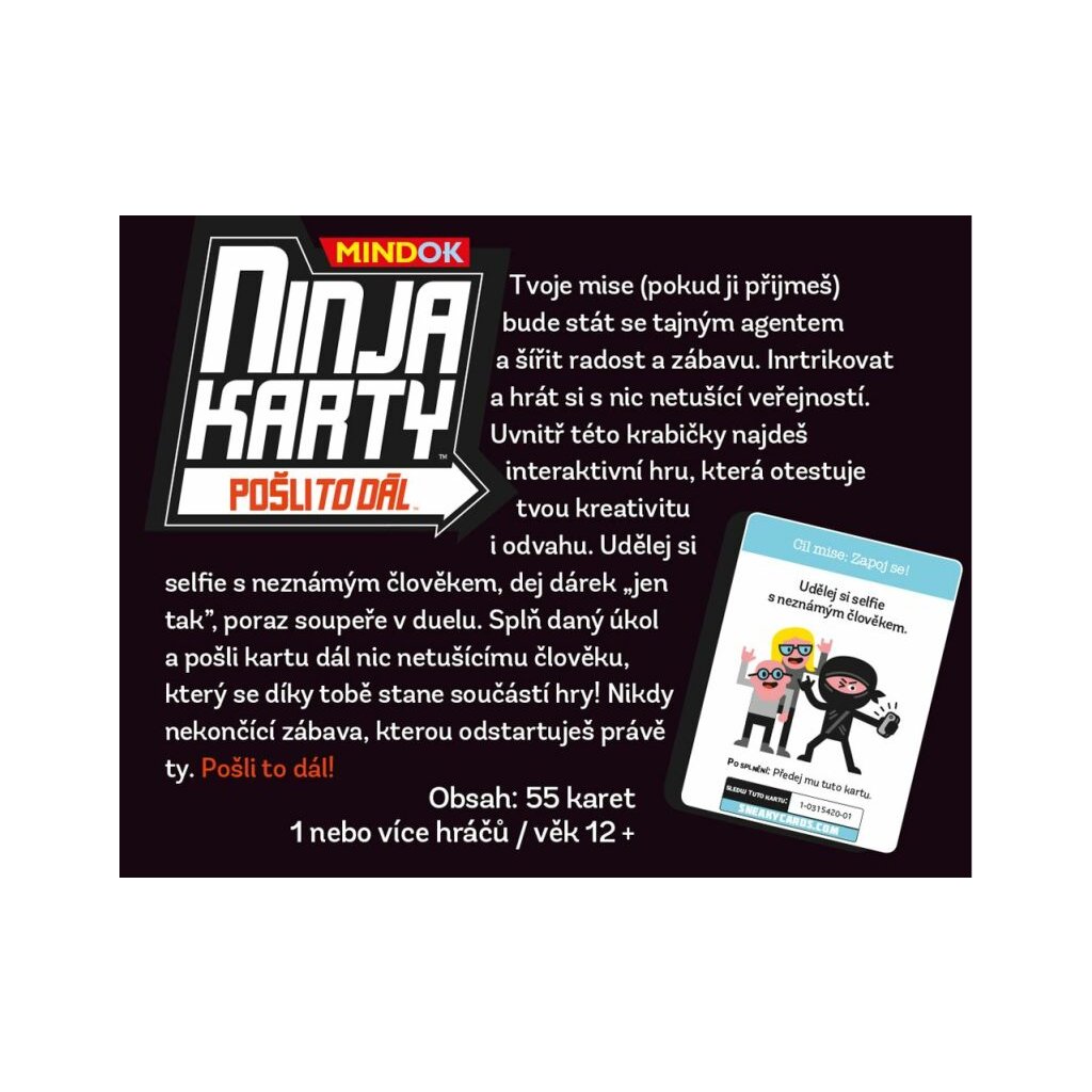 Tvoje mise (pokud ji přijmeš) bude stát se tajným agentem a šířit radost a zábavu. Intrikovat a hrát si s nic netušící veřejností. Uvnitř této krabičky najdeš interaktivní hru, která otestuje tvou kreativitu i odvahu. Udělej si selfie s neznámým člověkem, dej dárek „jen tak”, poraz soupeře v duelu. Splň daný úkol a pošli kartu dál nic netušícímu člověku, který se díky tobě stane součástí hry! Nikdy nekončící zábava, kterou odstartuješ právě ty. Pošli to dál!Hra Ninja karty obsahuje 6 kategorií úkolů. Je určena pro jednoho i nekonečný počet hráčů. Aktuální pozici karet můžeš sledovat přes web sneakycards.com.