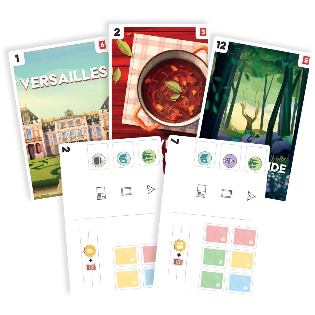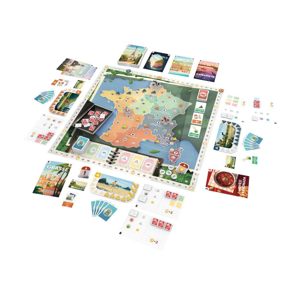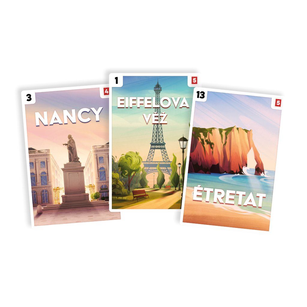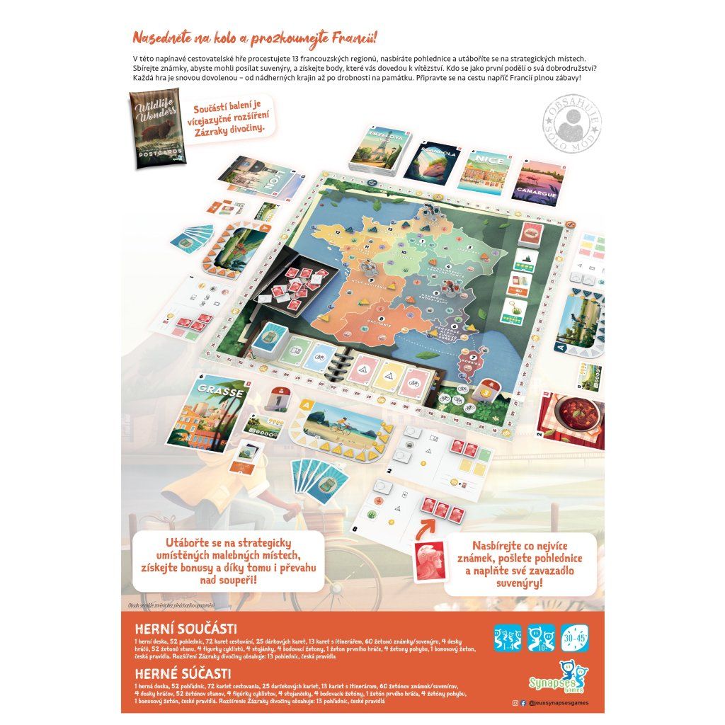 V této napínavé cestovatelské hře procestujete 13 francouzských regionů, nasbíráte pohlednice a utáboříte se na strategických místech. Sbírejte známky, abyste mohli posílat suvenýry, a získejte body, které vás dovedou k vítězství. Kdo se jako první podělí o svá dobrodružství? Každá hra je snovou dovolenou – od nádherných krajin až po drobnosti na památku. Připravte se na zábavnou cestu napříč Francií! Při hře Pohlednice procestujete na kole celou Francii, postavíte si stan v tábořištích a nasbíráte pohlednice, které pošlete svým blízkým. Táboření vám umožní zapisovat si vzpomínky, za které získáte různé bonusové efekty. Posílání pohlednic vám přinese body a cenné dárkové předměty! Utábořte se na strategicky umístěných malebných místech, získejte bonusy a díky tomu i převahu nad soupeři! Nasbírejte co nejvíce známek, pošlete pohlednice a naplňte své zavazadlo suvenýry! Hra obsahuje sólový režim. Součástí balení je vícejazyčné rozšíření Zázraky divočiny. Proč byste si měli hru koupit - Díky propracovanému systému známek a tábořišť vytvoříte cestu přes Francii tak, aby každý krok přinášel nové možnosti i zajímavé rozhodování - Herní mapa působí živě a nabízí vám radost z postupného objevování regionů, kde každý bod na cestě něco znamená a přináší nový impulz - Krátké partie vás motivují zkoušet odlišné přístupy, takže každá další hra otevře nový strategický nápad nebo lehce jiný způsob plánování - Karty itinerářů vám dávají osobní dlouhodobý cíl, díky kterému má partie přirozený spád a napětí až do poslední pohlednice - Dárkové karty mění průběh partie a nabízejí silné jednorázové efekty, které zvrátí situaci a dovolí vám reagovat na soupeře - Mechanika posílání pohlednic je jednoduchá, odměňující a dává hře jasný rytmus postupu k vítězství - Herní tempo je svižné, protože každý tah má tři kroky, které vás neustále posouvají dál a zajišťují plynulou dynamiku partie - Sólový režim nabízí férovou výzvu, díky níž můžete cestovat Francií i sami, a přesto mít pocit skutečného soupeření - Součástí balení je rozšíření, které přináší nové možnosti herního zážitku bez zbytečné složitosti pravidel - Grafické zpracování navozuje příjemnou cestovní atmosféru a připomíná malý ilustrovaný deník dobrodružství Obsah balení: 1 herní deska 52 pohlednic 72 karet cestování 5 dárkových karet 13 karet s itinerářem 60 žetonů známky/suvenýru 4 desky hráčů 52 žetonů stanu 4 figurky cyklistů 4 stojánky 4 bodovací žetony 1 žeton prvního hráče 4 žetony pohybu 1 bonusový žeton česká pravidla Rozšíření Zázraky divočiny obsahuje: 13 pohlednic česká pravidlaDoplňkové parametry