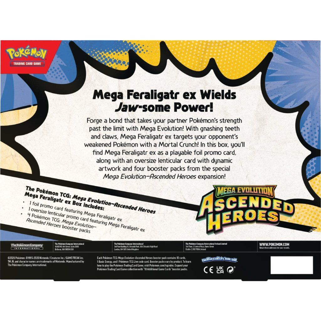 Obsah balení: • 4 boostery Pokémon TCG: Mega Evolution - Ascended Heroes • 1 foilová promo karta - Mega Feraligatr ex, Mega Emboard ex nebo Mega Meganium ex • 1 oversize 3D promo karta - Mega Feraligatr ex, Mega Emboard ex nebo Mega Meganium ex 3 druhy baleníDoplňkové parametry