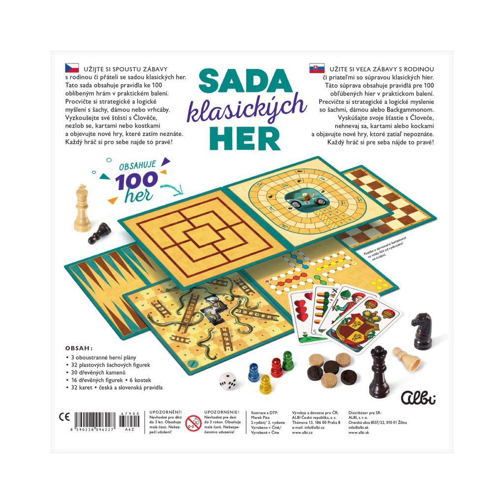 Užijte si spoustu zábavy s rodinou či přáteli se sadou klasických her. Tato sada obsahuje pravidla ke 100 oblíbeným hrám v praktickém balení. Sada klasických her obsahuje: 3 oboustranné herní plány, 32 plastových šachových figurek, 30 dřevěných kamenů, 16 dřevěných figurek, 6 kostek, 32 karet, česká a slovenská pravidla.Doplňkové parametry
