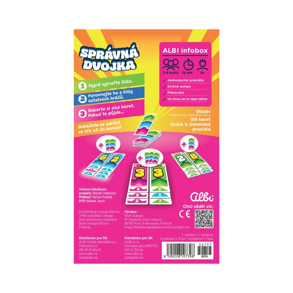 Napínavá karetní hra s čísly, ve které vyhraje ten, komu zůstanou karty nejdéle. Hra Správná dvojka obsahuje: 108 karet netradičního formátu, pravidla v českém a slovenském jazyce.Doplňkové parametry