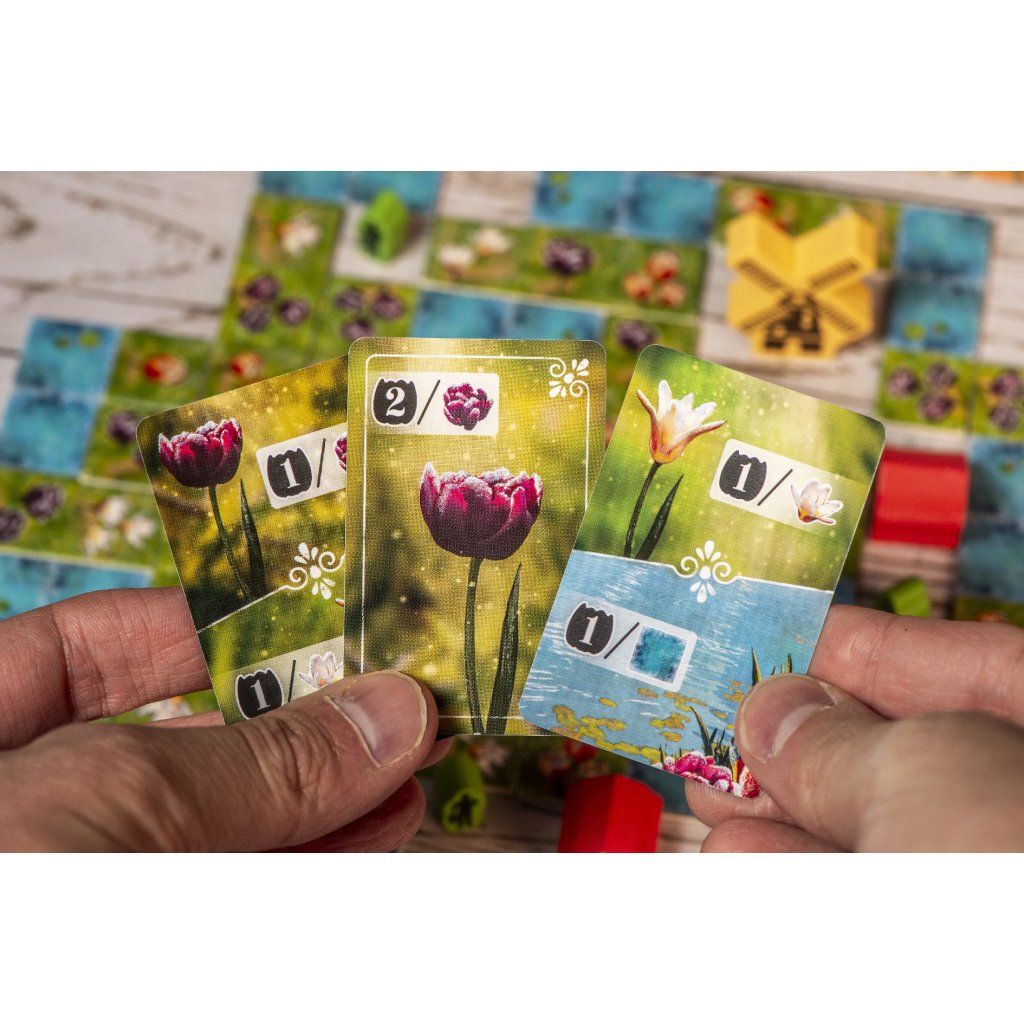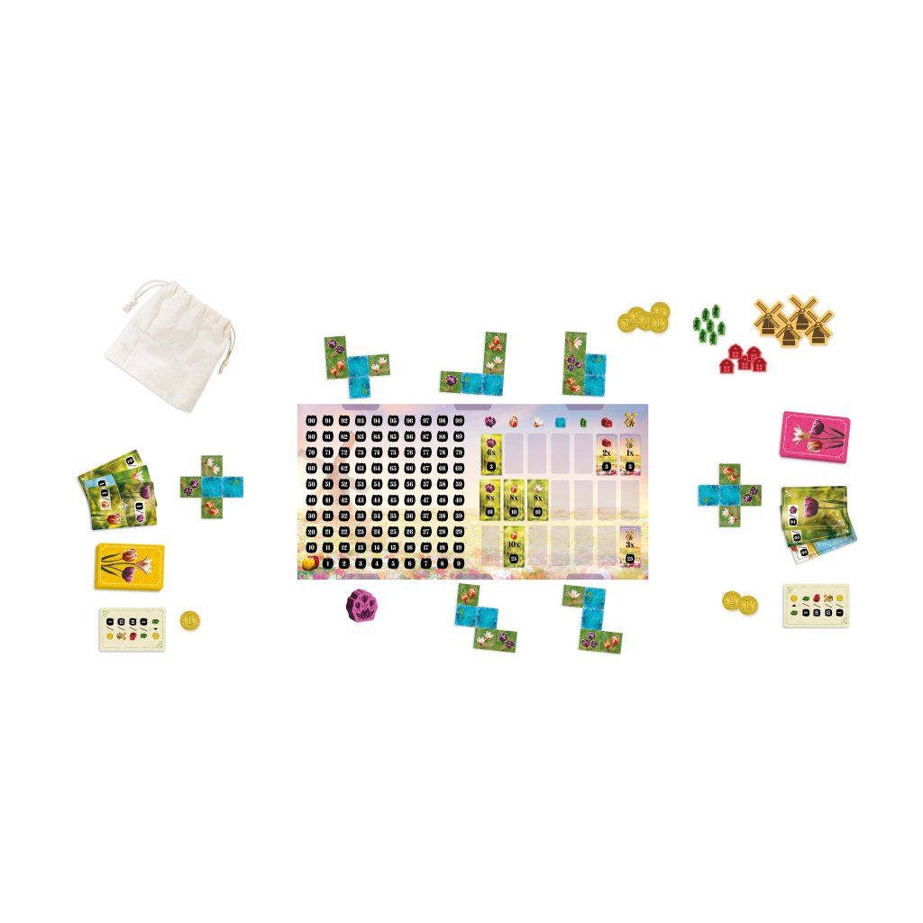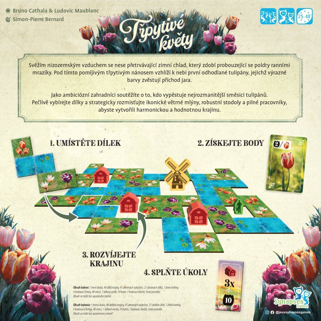 Svěžím nizozemským vzduchem se nese přetrvávající zimní chlad, který zdobí probouzející se poldry ranními mrazíky. Pod tímto pomíjivým třpytivým nánosem vzhlíží k nebi první odhodlané tulipány, jejichž výrazné barvy zvěstují příchod jara. Jako ambiciózní zahradníci soutěžíte o to, kdo vypěstuje nejrozmanitější směsici tulipánů. Pečlivě vybírejte dílky a strategicky rozmisťujte ikonické větrné mlýny, robustní stodoly a pilné pracovníky, abyste vytvořili harmonickou a hodnotnou krajinu. Ve hře Třpytivé květy hráči během 10 kol soutěží o vytvoření nejhodnotnější tulipánové zahrady. Ve svém kole si vyberete dílek krajiny, přidáte ho do své zahrady a zahrajete z ruky kartu, která vám přinese vítězné body v závislosti na umístěném dílku. Chytrým umisťováním dílků vytvořte oblasti pro umístění pracovníků, stodol a větrných mlýnů. Ti vám spolu s úkoly, které splníte během hry, přinesou při závěrečném bodování další body navíc. Hráč, který nasbírá nejvíce bodů, zvítězí. Obsahuje sólo mód Mistr zahradník. V tomto sólo módu vyzvete na souboj Mistra zahradníka. Mistr zahradník je automa, která zná tajemství, jak vytvořit perfektní zahradu. Hraje podle svých vlastních pravidel. Pokud budete mít na konci hry více bodů, prozradí vám své tajemství a vy se stanete novým Mistrem zahradníkem. Proč byste si měli hru koupit -Nabízí přístupná pravidla, která se snadno vysvětlují, ale přesto poskytují dostatek prostoru pro promyšlené plánování a dlouhodobou strategii. - Spojuje skládání dílků s chytrým bodovacím systémem, který vás nutí přemýšlet nad každým umístěním a jeho návazností. - Každá zahrada se vyvíjí jinak, takže každá partie působí odlišně a podporuje opakované hraní. - Mechanismus výběru dílků pomocí žetonu květiny vytváří zajímavá rozhodnutí mezi investicí mincí a ideálním tvarem dílku. - Karty krajiny přinášejí variabilní bodování a nutí hráče reagovat na aktuální podobu své zahrady. - Vylepšení v podobě pracovníků, stodol a větrných mlýnů dávají hře další strategickou hloubku a jasný cíl pro závěrečné bodování. - Úkolové dílky odměňují různé herní styly a umožňují zaměřit se na odlišné způsoby bodování. - Sólový mód Mistr zahradník umožňuje plnohodnotné hraní i bez spoluhráčů a představuje systematickou výzvu. - Kratší herní doba zajišťuje svižné tempo a možnost zahrát si více partií za sebou. - Téma pěstování tulipánů je zpracováno přehledně a srozumitelně, takže hra působí příjemně i při opakovaném hraní. Obsah balení: 1 herní deska 48 dílků krajiny 45 dřevěných vylepšení 21 úkolových dílků 1 žeton květiny, 4 bodovací žetony 40 mincí 1 látkový pytlík 59 karet 1 bodovací bloček česká pravidlaDoplňkové parametry